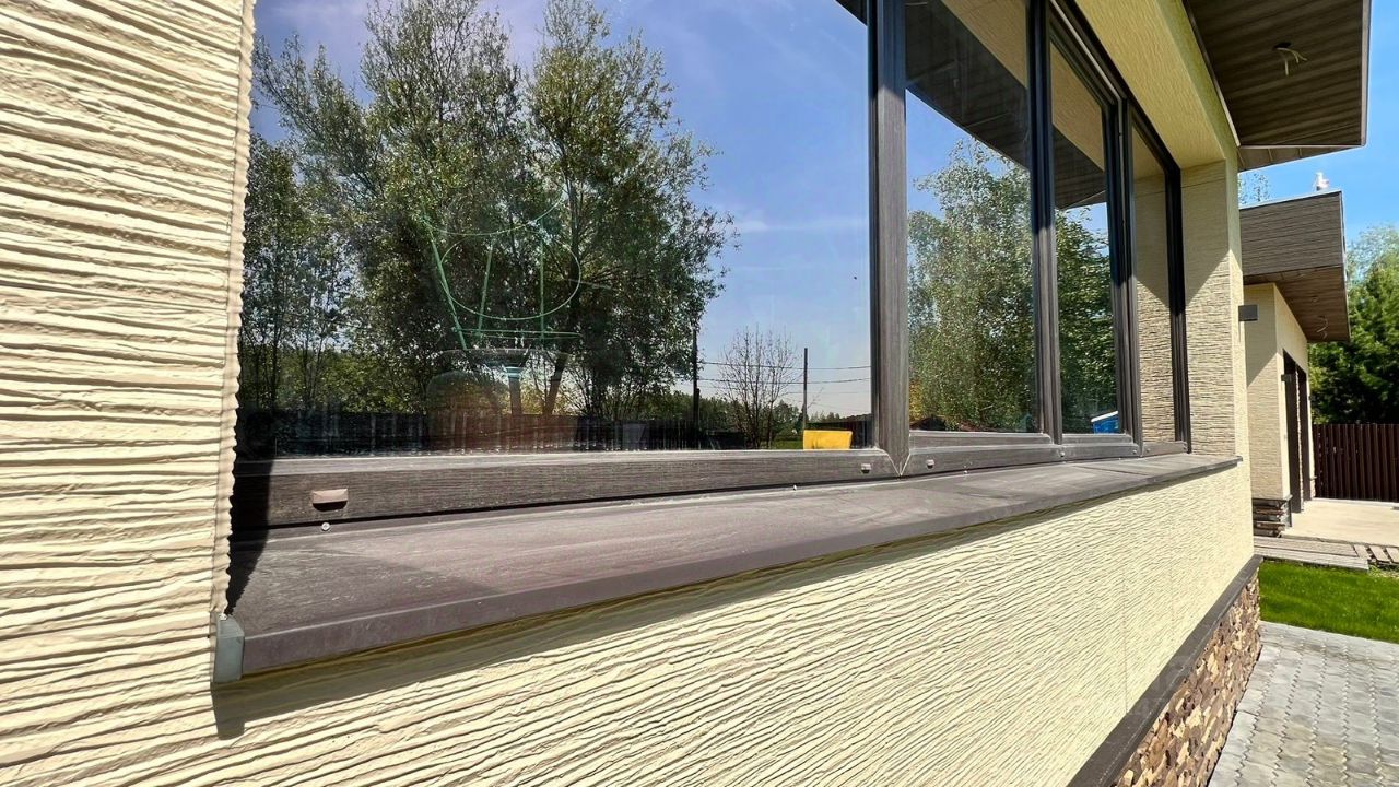 Построен из блока poroterm( летом не жарко, зимой не холодно) Фасад вентилируемый из фиброцементных японских панелей, цоколь -натуральный камень кондиционеры во всех помещениях