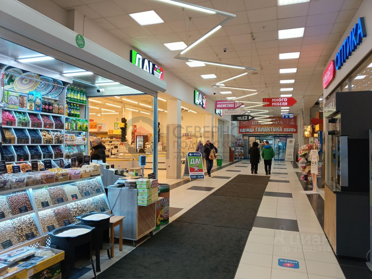 Помещение находится на 1-м этаже 3-х этажного торгового комплекса, рядом с эскалатором на 2 этаж, . 3 входа в здание. Работает кондиционер. Все помещения заняты арендаторами: супермаркет ''Да!'', магазины бытовой техники ''Эльдорадо'', одежды, парфюмерии, салоны связи, аптека, оптика, салон красоты, фитнес-центр.