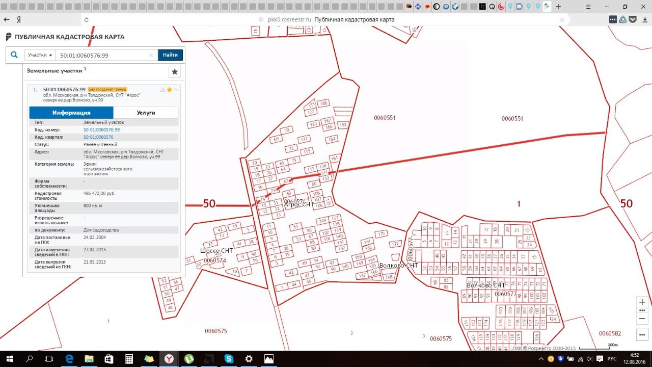 Участок с кадастровым номером 50:01:0060576:99, расположенный по адресу: Московская область, Талдомский район, СНТ ''Агрос'' севернее дер. Волково, участок 99. Категория земель: земля СНТ, можно строить. Площадь: 800 кв. м. Участок расположен в середине садового товарищества, с трёх сторон соседи. Соседи очень хорошие. Товарищество очень тихое и уютное. Участок сухой. Ровный. Прямоугольной правильной формы 20 на 40 метров. К участке есть электричество - столб рядом. Цена более чем в два раза ниже кадастровой. Выгодное вложение денег в кризис - перепродадите намного дороже! Товарищество жилое, есть сторож на входе, председатель живет в СНТ постоянно. Участок прошел межевание в марте 2017 г.