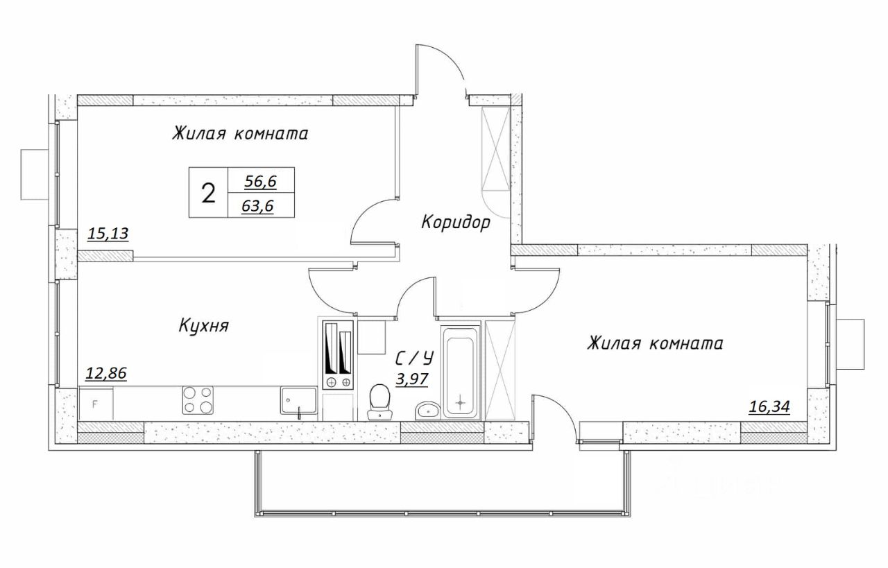 Продается полностью готовая 2-комн. квартира площадью 63,6 кв.м. (56,6 кв.м. без учета лоджии) в новом доме ЖК Шоколад.