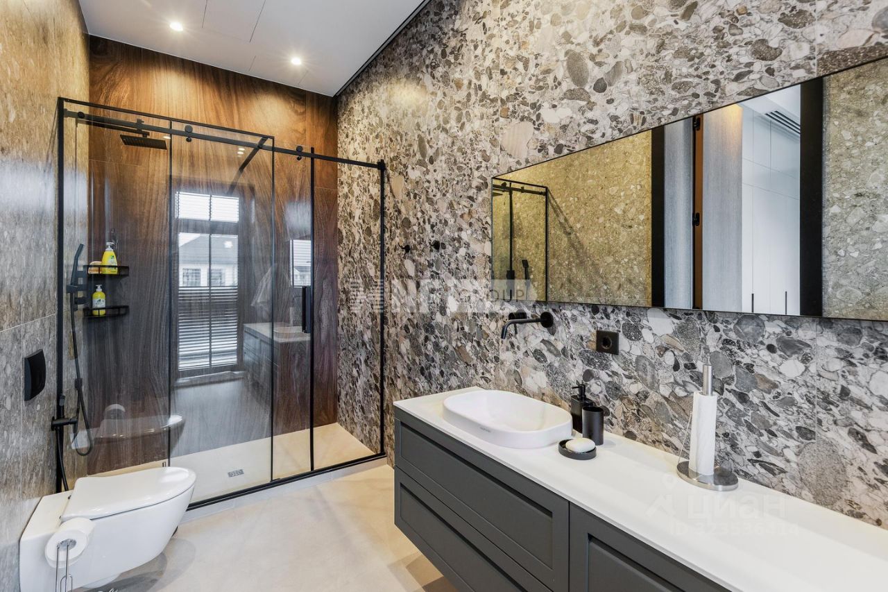 Строительство дома выполнено с применением натуральных материалов. Большое внимание уделено освещению: в каждой комнате панорамные окна, этажи объединены вторым светом.